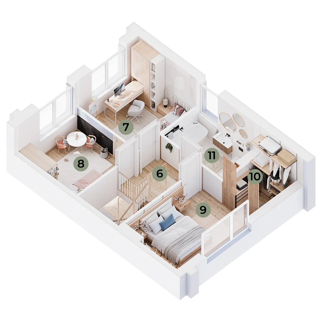 W domu o powierzchni 90 m² masz wybór: przestronna garderoba czy dodatkowy pokój – idealny na gabinet lub sypialnię. W wariancie 80 m² przewidziano funkcjonalną garderobę, która ułatwi organizację przestrzeni.