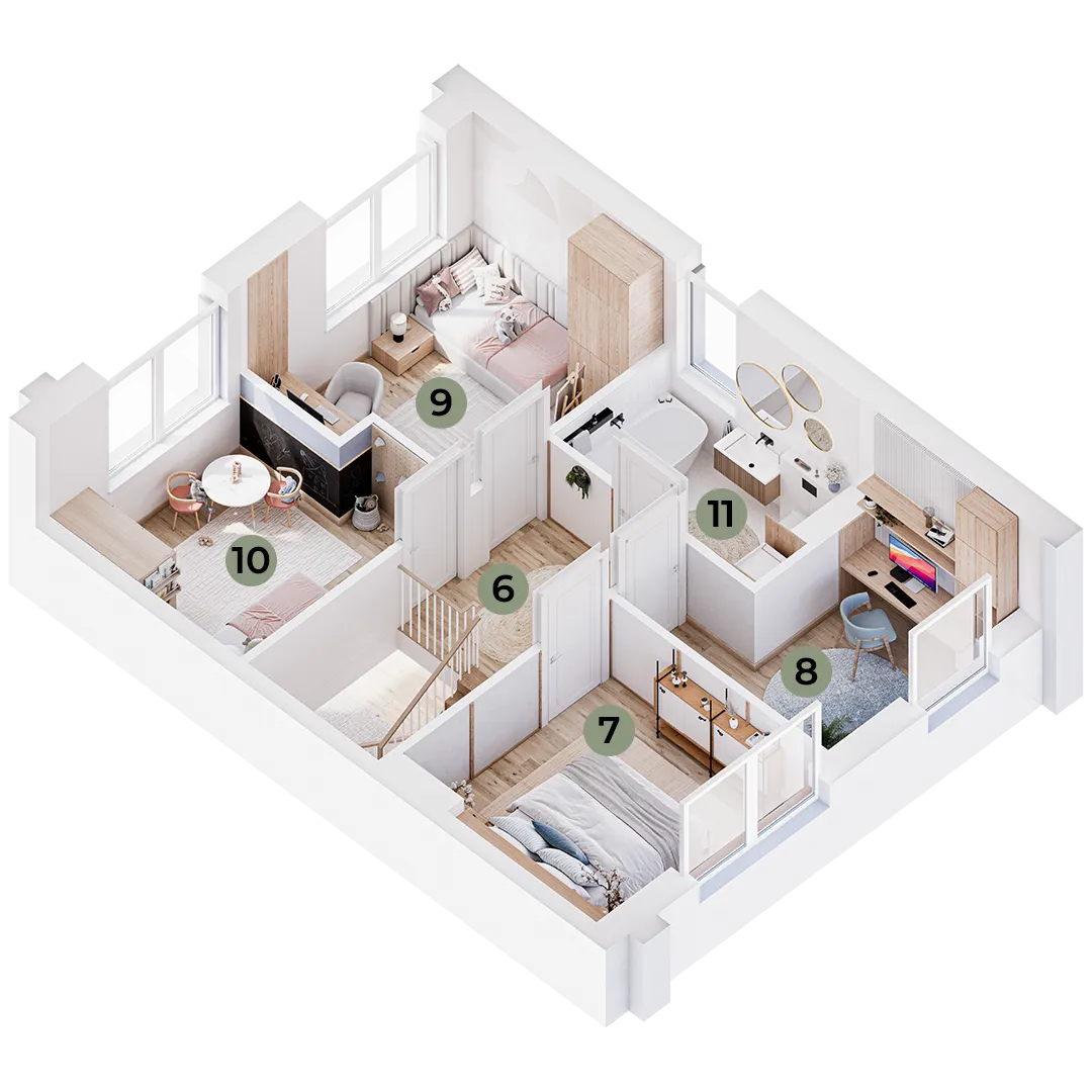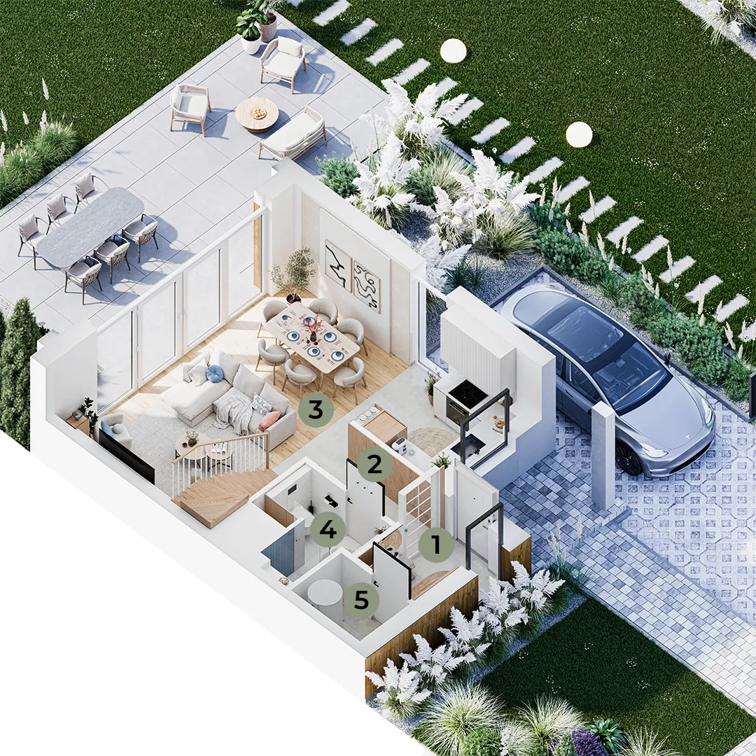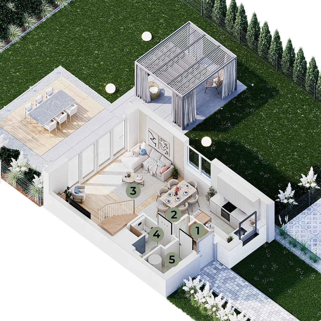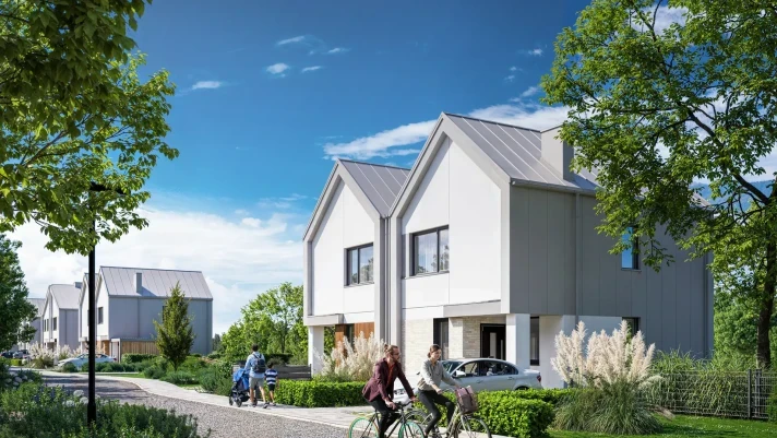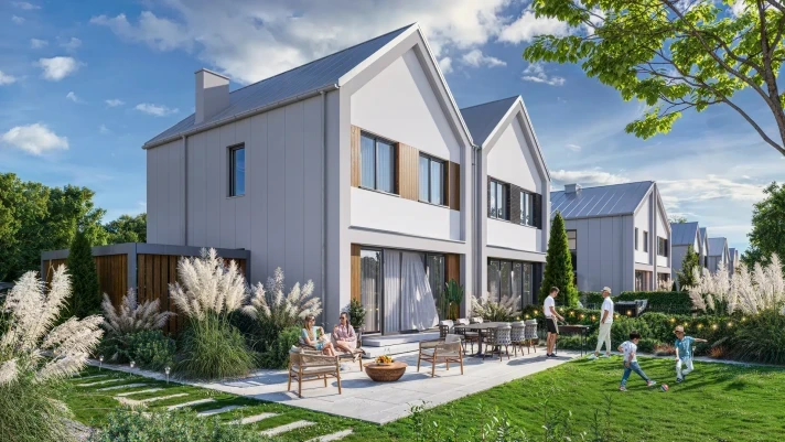 Na osiedlu powstanie 30 domów zaprojektowanych z dbałością o funkcjonalność i komfort. Możesz wybrać między domem o powierzchni 80 m² z czterema pokojami lub domem o powierzchni 90 m² z pięcioma pokojami – oba zaprojektowane tak, by odpowiadały różnym stylom życia i potrzebom nowych mieszkańców. Każdy dom otacza przestronny ogród, który stanie się Twoją prywatną strefą relaksu. Przewidziano także prywatne miejsce postojowe – z możliwością rozszerzenia o dodatkowe miejsce i/lub wiatę garażową.